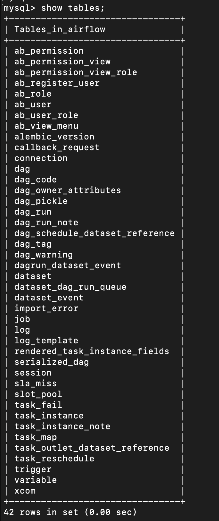 airflow db init으로 생성된 테이블 정보는 다음과 같습니다.