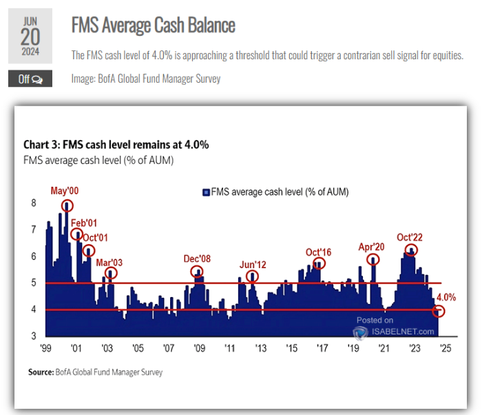 2024년 6월 현재 FMS 현금 수준이 4.0% 정도에 도달하면 주식에 대한 반대 매도 신호를 촉발할 수 있는 임계값에 접근하는 것으로 간주됩니다. 이는 펀드 매니저들이 주식에 과도하게 투자하고 있어 시장이 과매수 상태일 수 있음을 시사합니다. 현재 현금 수준은 3년 만에 최저치로 떨어지면 주식 시장의 조정 가능성이 높아질 수 있습니다.